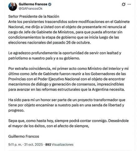 El propio Francos hizo público su dimisión a través de una carta pública dirigida al presidente Javier Milei, en la que atribuyó su decisión a los "persistentes trascendidos sobre modificaciones en el Gabinete Nacional".