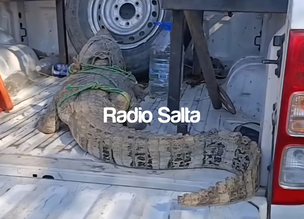 El yacaré, que casi llenaba la caja de la camioneta, fue inmovilizado con cuerdas.