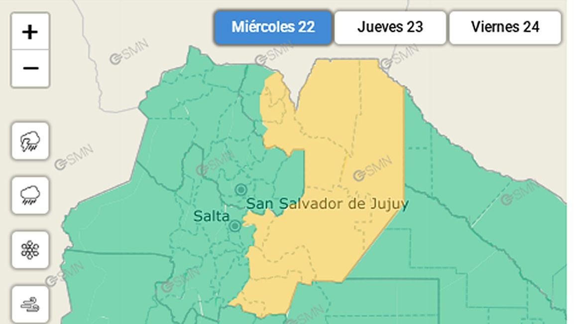 El Servicio Meteorológico Nacional emitió un alerta nivel amarillo por tormentas para varios departamentos de Salta, con vigencia desde las 18:00 de hoy hasta las 06:00 de este jueves 23 de octubre. Se esperan lluvias intensas, actividad eléctrica, granizo y ráfagas que podrían alcanzar los 90 km/h.
