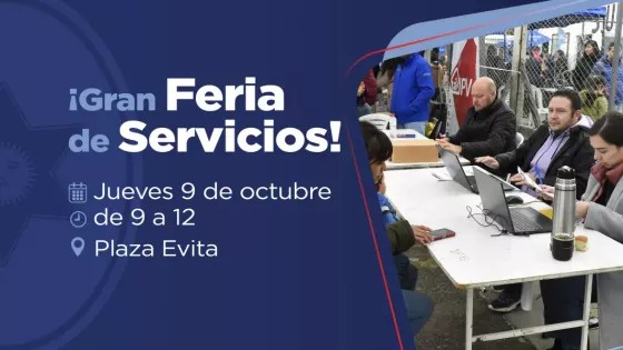 El Gobierno provincial, junto a la Municipalidad de la Ciudad de Salta y el Concejo Deliberante, organizaron una Gran Feria de Servicios que comenzará el jueves 9 de octubre en Plaza Evita, de 9 a 12 hs, para luego continuar el viernes 17 en Paseo del Legado y cerrar el miércoles 22 en las canchas de básquet externas del Estadio Delmi, los tres días con idéntico horario.