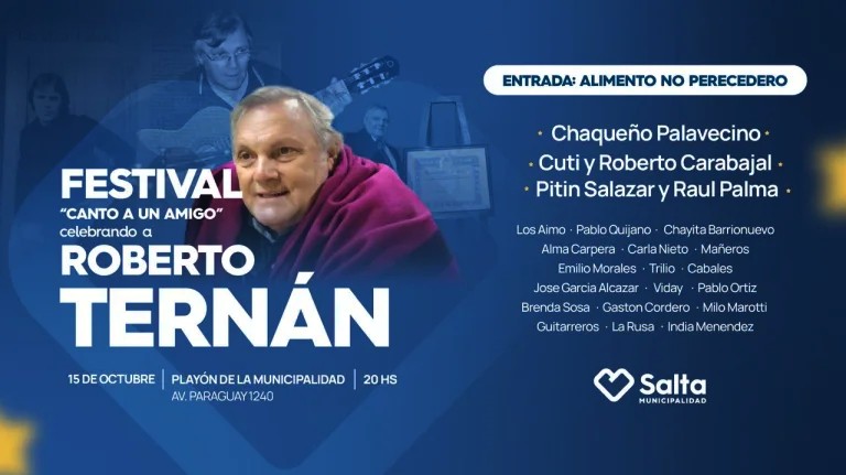 La Municipalidad de Salta, a través de la Agencia de Cultura Activa, acompaña e invita a la comunidad a participar del festival “Canto a un Amigo: celebrando a Roberto Ternán”, un merecido homenaje en vida al reconocido cantautor, músico, poeta y escritor salteño, figura fundamental del folclore argentino.