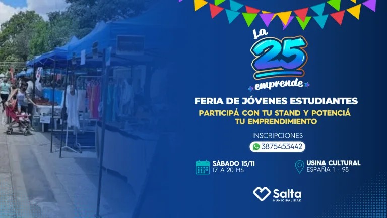 La feria se desarrollará el sábado 15 de noviembre de 17 a 20 hs en la Usina Cultural. Habrá más de 40 stands de jóvenes estudiantes de 3º, 4º y 5º de colegios públicos y privados. Se invita a las familias a participar y apoyar a jóvenes emprendedores.
