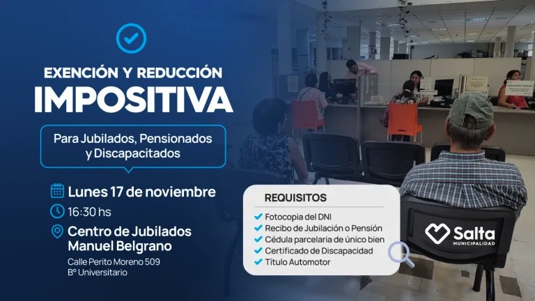 Para seguir llegando a más salteños, personal de Rentas atenderá consultas sobre este tema, el lunes 17 de noviembre en el Centro de Jubilados de barrio Universitario. El box de atención estará disponible desde las 16.30. Los sectores alcanzados por este beneficio son:
