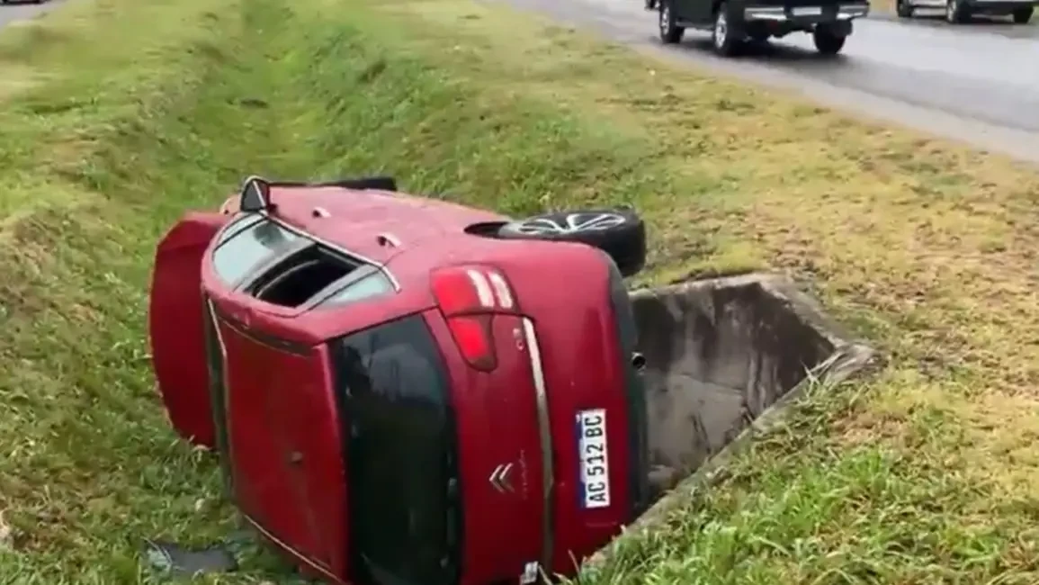 En ese punto, el conductor se encontró con un banco de agua acumulada sobre la calzada, perdió adherencia y terminó volcando hacia el canal que separa las manos de circulación (Este-Oeste, Oeste-Este).