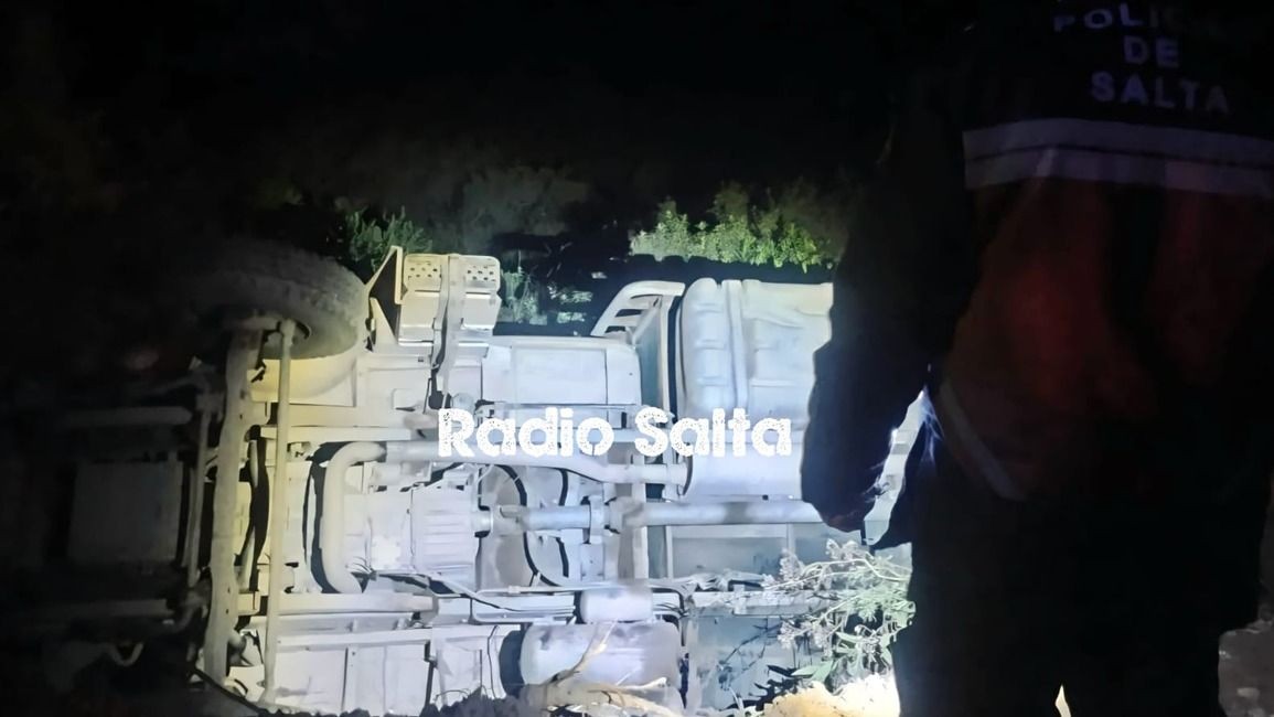 El camionero decidió estacionar en la banquina, pero las recientes lluvias provocaron que el terreno se deslizara y fue encontrado apoyado sobre su lateral derecho.