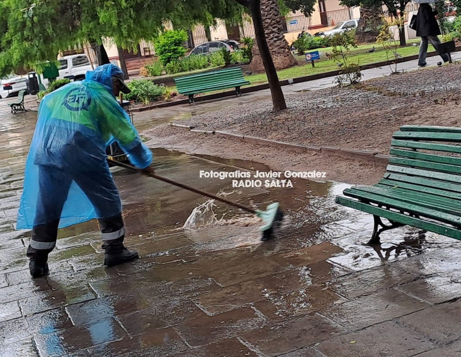 En el centro, un trabajador de Agrotécnica Fueguina utiliza un cepillo para retirar el agua acumulada en la vereda de Plaza Belgrano.