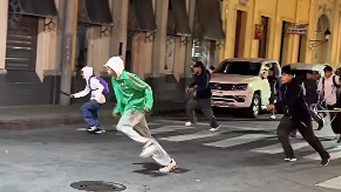 Los adolescentes armados con palos y machetes causaron caos en la intersección de calles Mitre y General Güemes, a una cuadra de la Central de Policía.