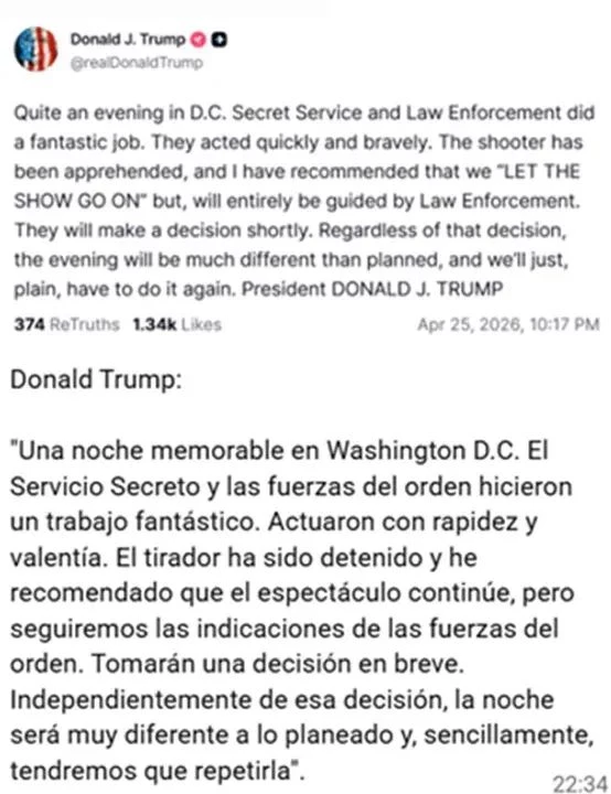 Minutos después de la evacuación, Trump se expresó en su red Truth Social, donde calificó lo ocurrido como “una noche intensa” y destacó el accionar de las fuerzas de seguridad. El mandatario aseguró que el presunto atacante fue detenido y señaló que había sugerido que “el espectáculo continúe”, aunque aclaró que seguiría las recomendaciones de los organismos de seguridad.