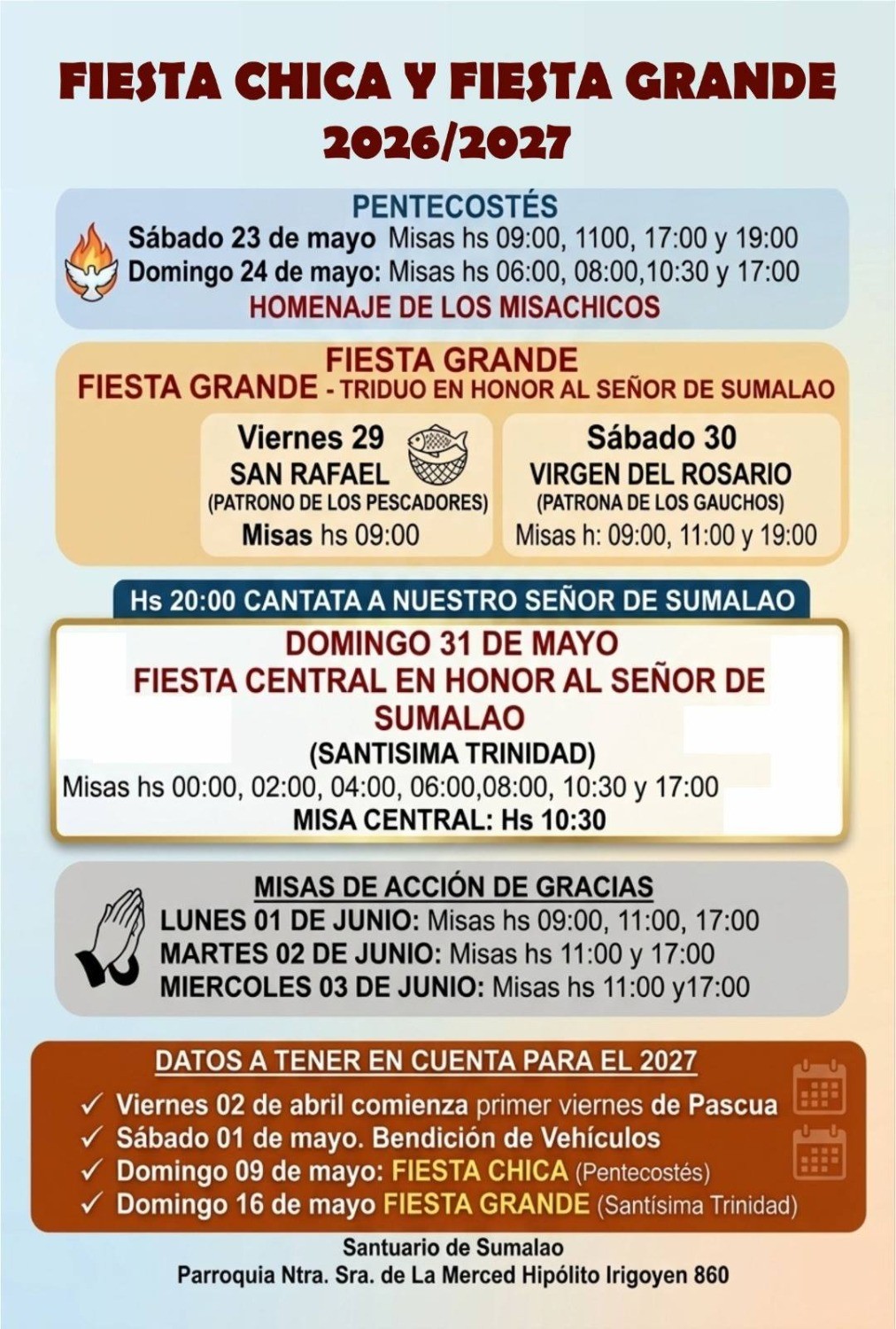 Los días 10, 17 y 24 de abril; 1, 8, 15 y 22 de mayo habrá servicios especiales para las misas de 9, 11 y 17 hs, que partirán hacia Sumalao a las 7.30; 9:25; 9:35; 9:45; 15:25; 15:35 y 15:45hs. La salida desde Sumalao hacia la ciudad de Salta está programada para las 10.30; 12.40; 12.50; 13.00; 18.25; 18.35 y 18.45hs.