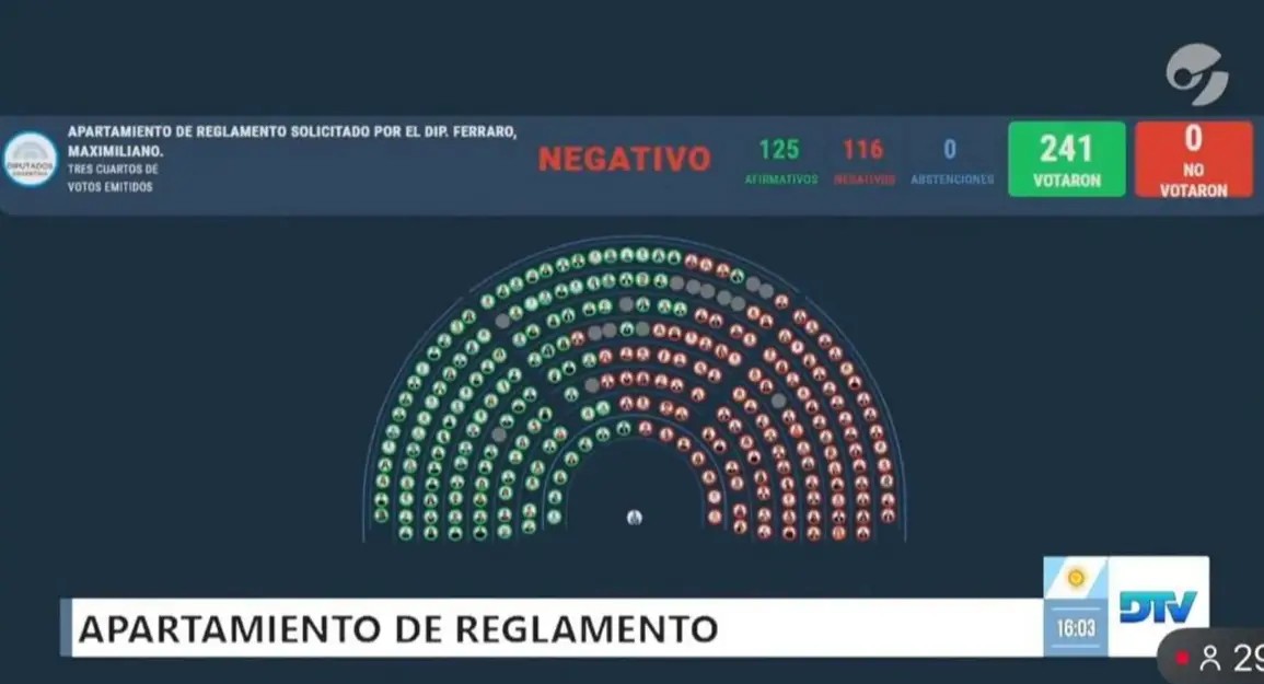 La votación arrojó 125 votos positivos y 116 negativos, pero como los expedientes no tenían dictamen se hubiera requerido una mayoría agravada de las tres cuartas partes de los diputados presentes.